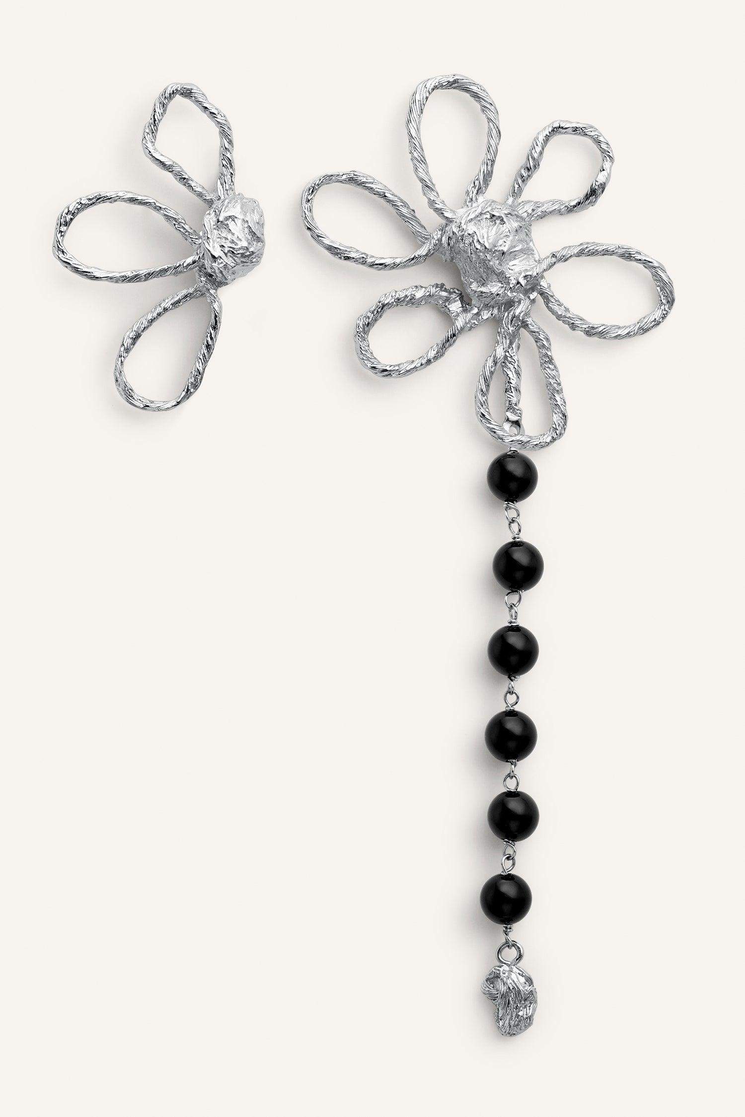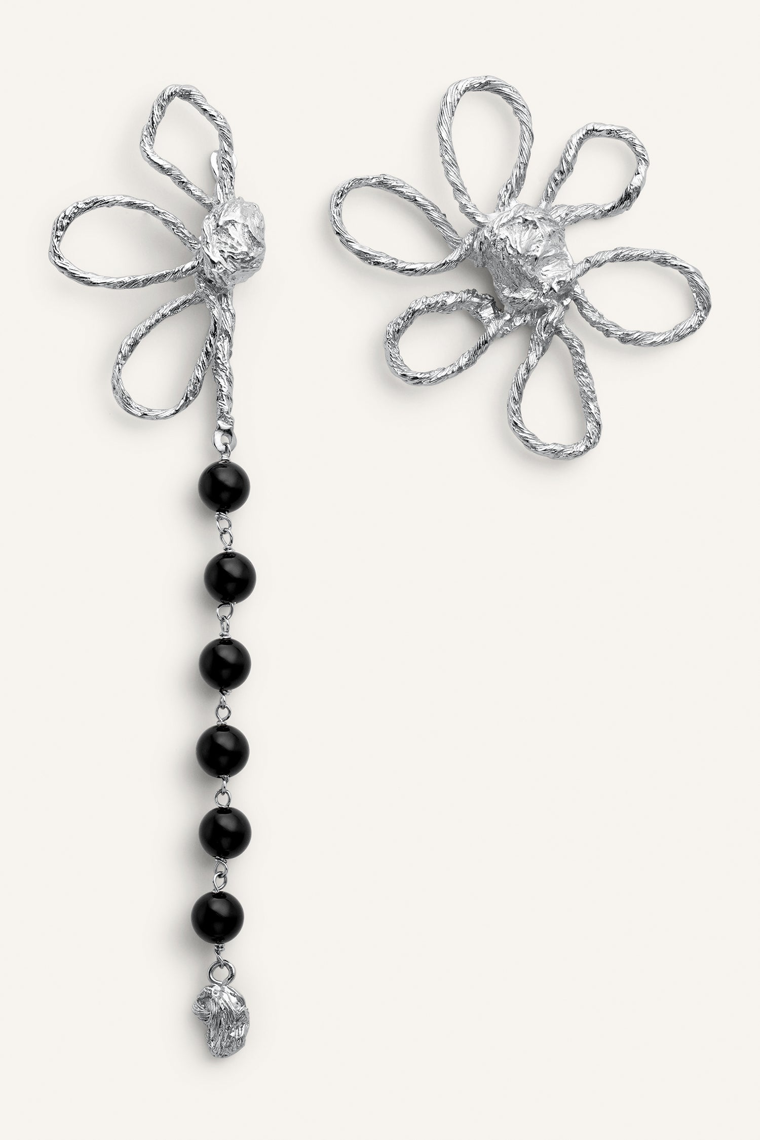 Los pendientes Olivia 3x1, en plata 925, son la máxima expresión de versatilidad y sofisticación. Un diseño único que permite jugar con su estructura: un solo par, tres formas de llevarlos. Flores esculpidas en latón bañado en plata se combinan con ónix naturales en una composición envolvente y sublime.