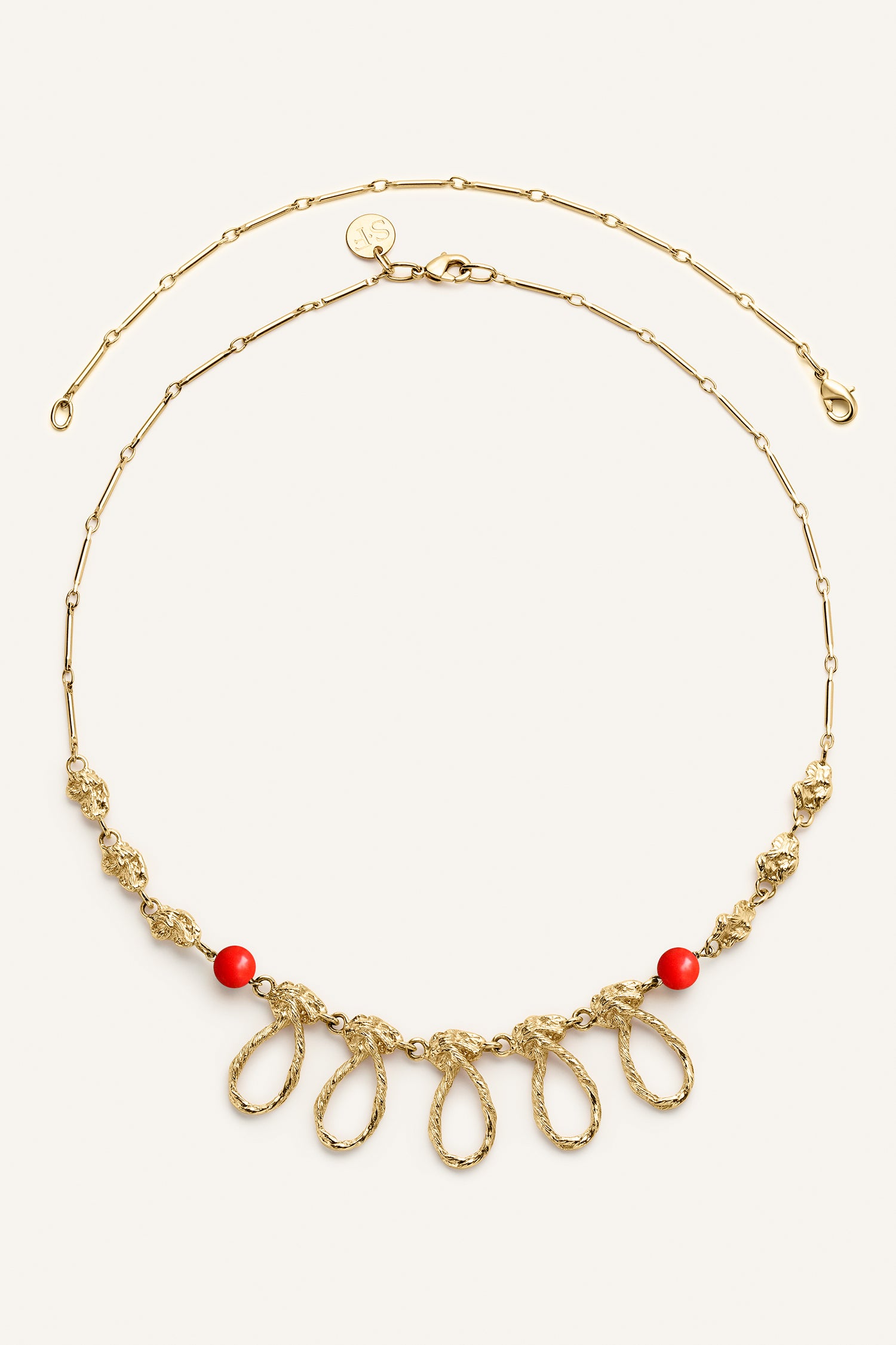 El Collar Macarena II Coral evoca la elegancia de los collares etruscos que realzaban el cuello femenino con sofisticación atemporal. Su diseño artesanal, trabajado a mano, convierte cada pieza en una joya única.