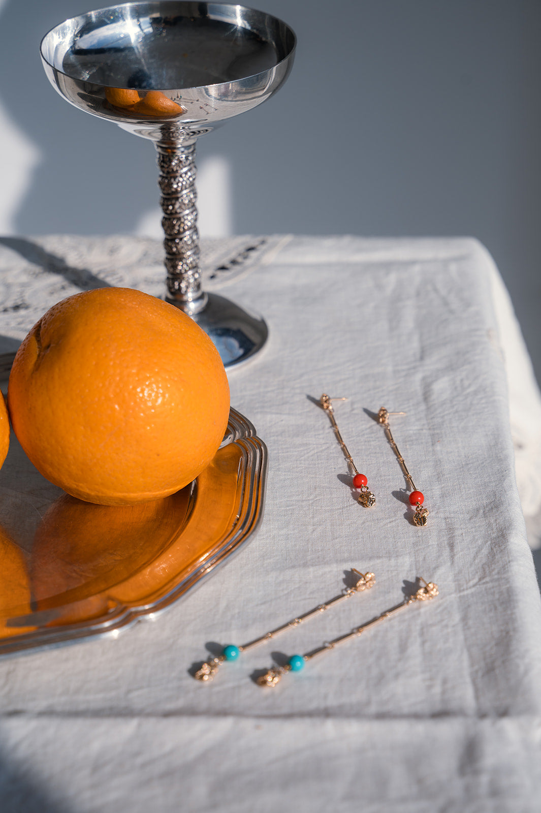 Los Pendientes Macarena Coral están elaborados artesanalmente en latón bañado en oro de 18 quilates. Su diseño representa el vínculo entre Sonia y su hermana Macarena, concebido como un homenaje al amor fraternal.