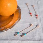 Los Pendientes L Macarena Turquesa están elaborados artesanalmente en latón bañado en oro de 18 quilates. Su diseño representa el vínculo entre Sonia y su hermana Macarena, concebido como un homenaje al amor fraternal.